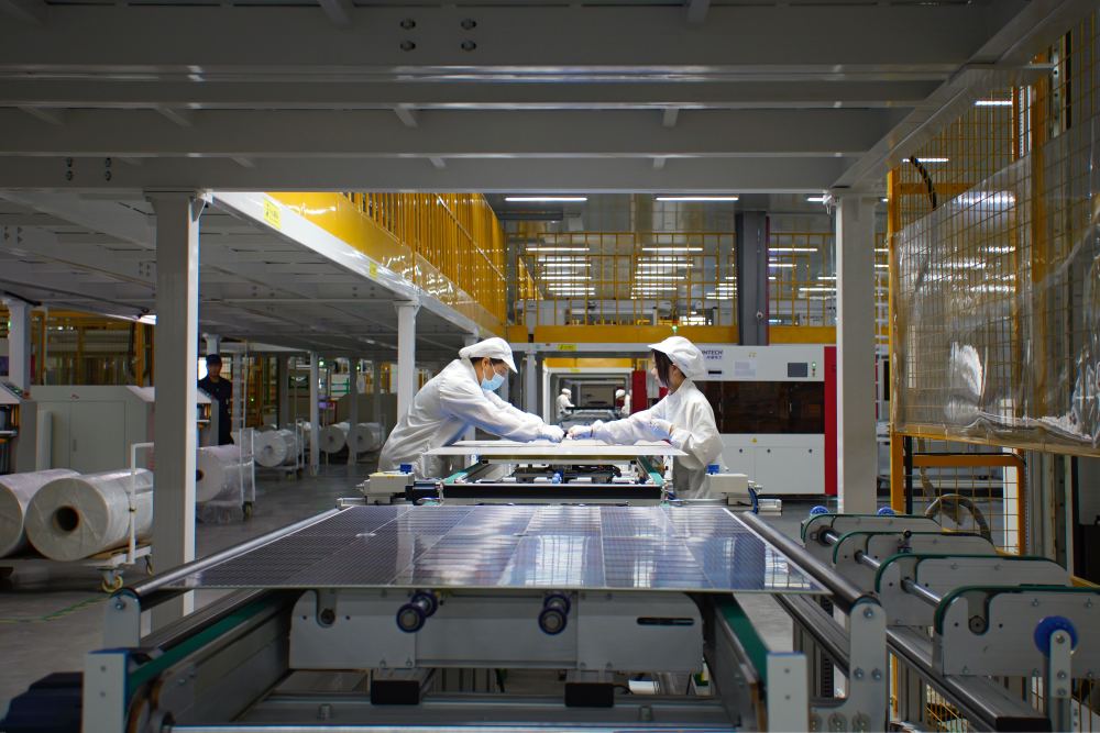 在安徽省滁州市鳳陽縣一家光伏企業(yè)內,工人在生產線上忙碌(2023年6月14日攝)。
