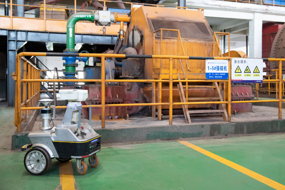 生產(chǎn)現(xiàn)場無人化,依靠什么來實現(xiàn)?步入磨磁車間,巨大的轟鳴聲在這個長約100米、寬約50米、高約30米的廠房內(nèi)回響。登上二樓作業(yè)平臺,兩臺直徑6.2米的大型球磨機上的轉(zhuǎn)輪正在飛速旋轉(zhuǎn)。不遠處,磨磁巡檢機器人閃爍著燈光,正在采集設(shè)備溫度、振動等狀態(tài)數(shù)據(jù)。