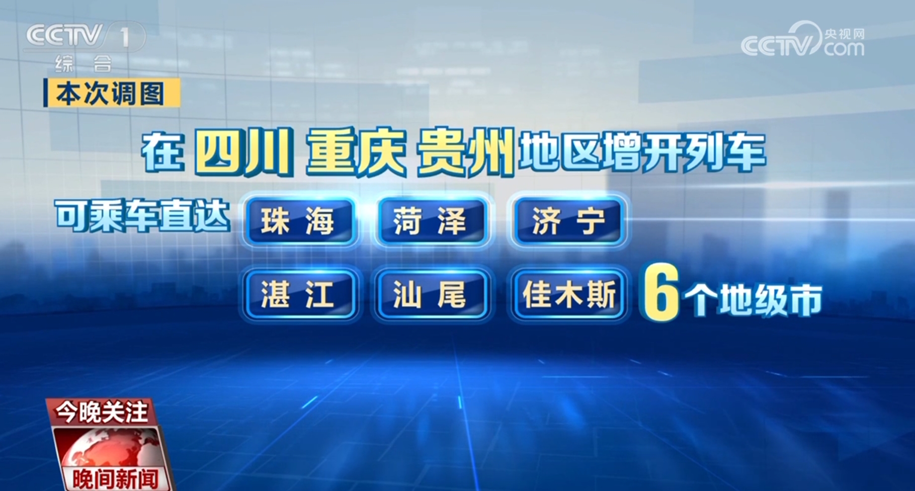 本次調(diào)圖,在鄭州、武漢、長沙等城市間增開復(fù)興號動車組標(biāo)桿列車28列,進(jìn)一步壓縮了中部地區(qū)省會城市間的時空距離;在四川重慶貴州地區(qū)增開列車,旅客從川渝貴三地可乘車直達(dá)珠海、菏澤、濟(jì)寧、湛江、汕尾、佳木斯6個地級市。此外,首開太原至深圳的動車組列車,旅行時間為8小時17分,較普速旅客列車壓縮了27小時57分。