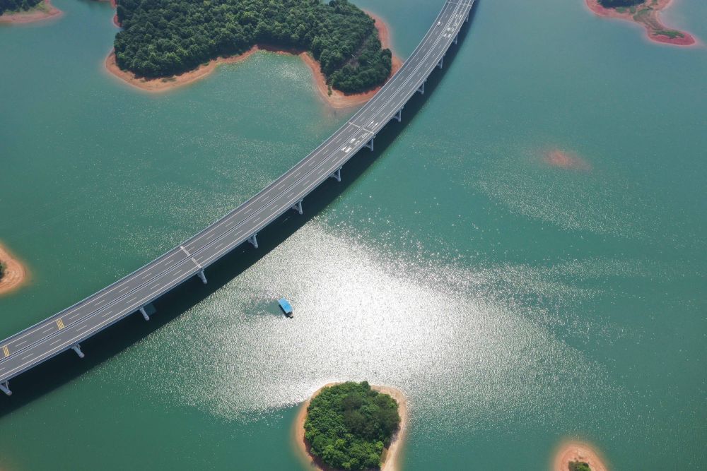這是位于江西省九江市永修縣與武寧縣交界處的廬山西海與跨過水面的永武高速公路(無人機(jī)照片,6月7日攝)。新華社記者 周密 攝