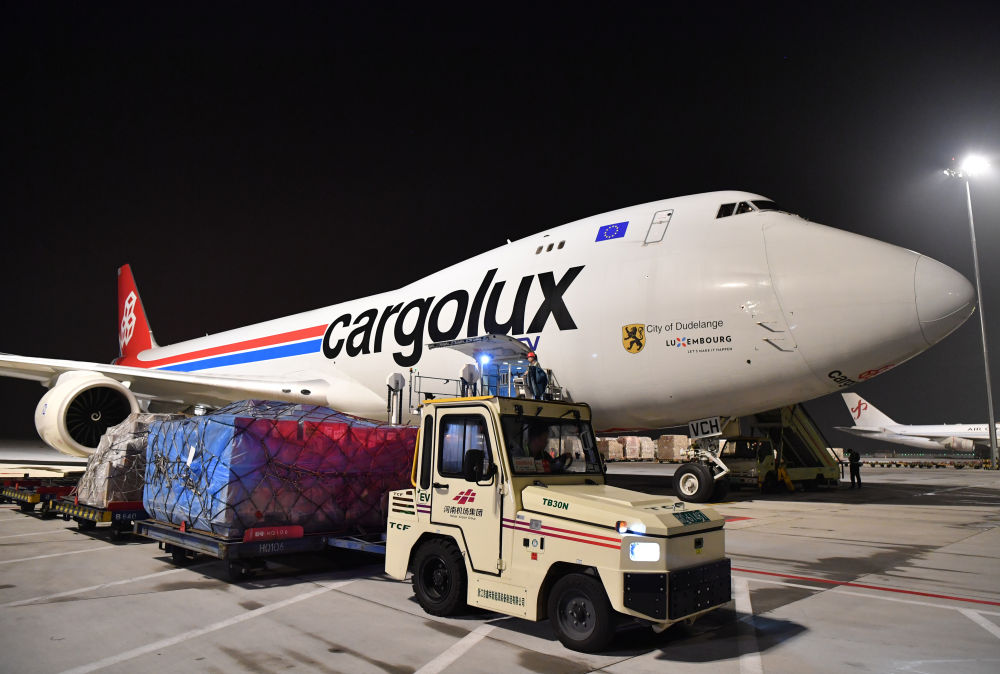 在鄭州新鄭國際機(jī)場(chǎng),工作人員駕駛新能源拖車為一架盧森堡貨航貨機(jī)卸貨(2023年8月1日攝)。新華社記者 李嘉南 攝
