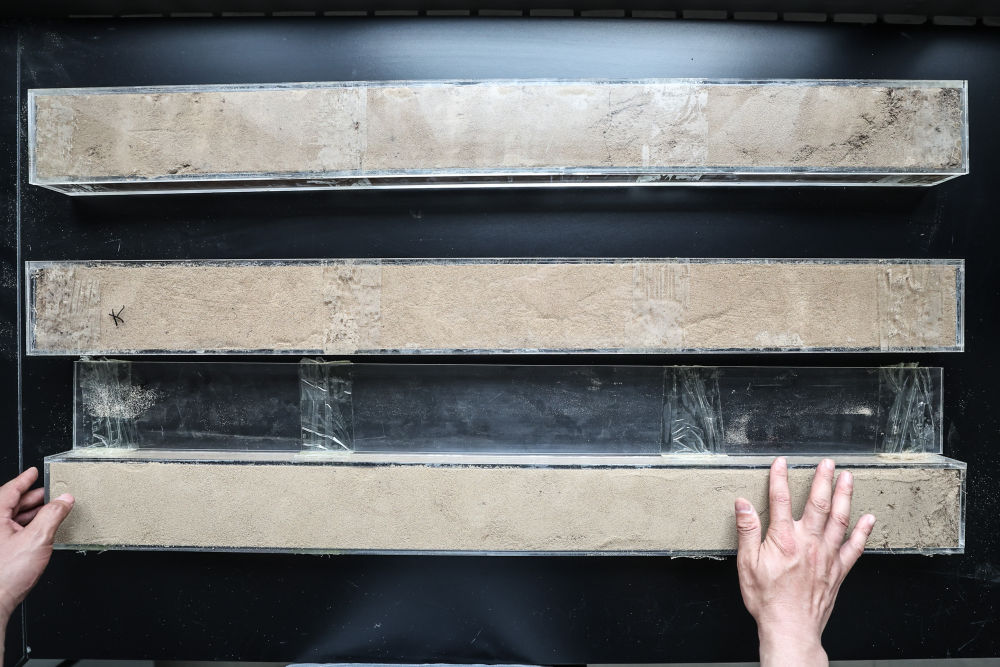 “草根博士”呂林有在遼寧省農(nóng)業(yè)科學(xué)院沙地治理與利用研究所章古臺(tái)基地實(shí)驗(yàn)室整理提取的沙地土壤剖面樣本(2024年5月30日攝)。新華社記者 潘昱龍 攝