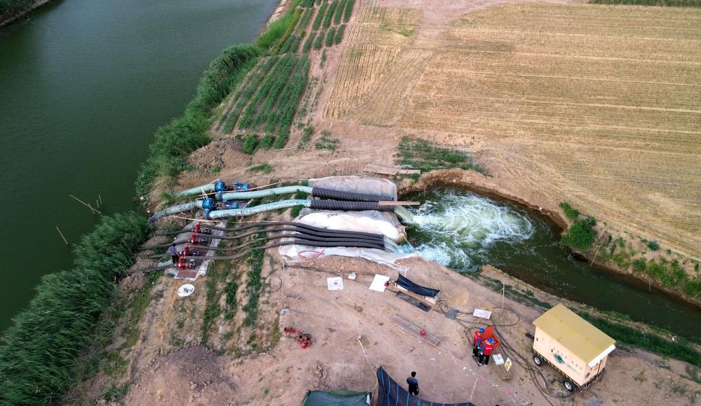 6月18日,在山東省巨野縣麒麟鎮(zhèn)的一處抗旱應(yīng)急取水點(diǎn),水泵正在抽水輸入農(nóng)田灌溉渠道(無(wú)人機(jī)照片)。新華社記者 徐速繪 攝