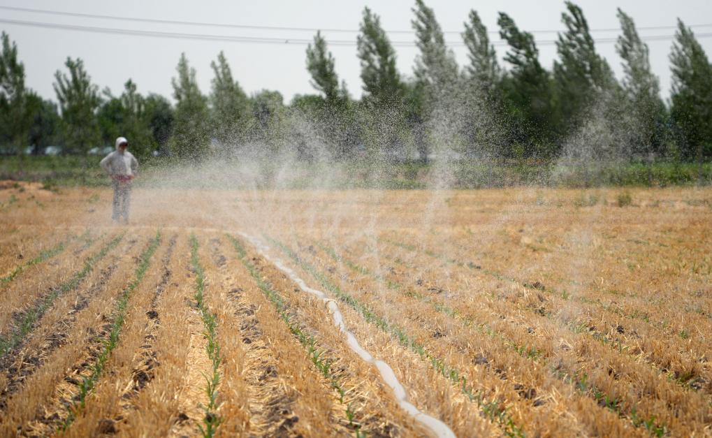 6月18日,在山東省菏澤市巨野縣麒麟鎮(zhèn)一處農(nóng)田,農(nóng)民江福華在灌溉玉米。新華社記者 王陽(yáng) 攝