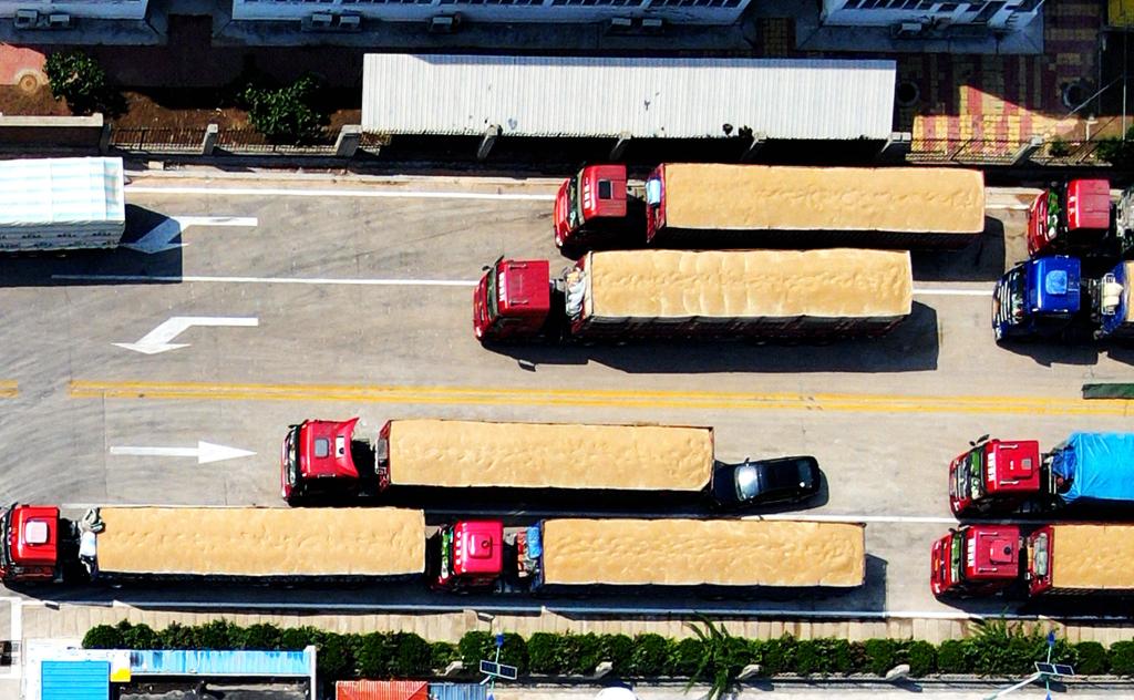6月15日,在山東省臨沂市平邑縣一處糧食儲(chǔ)備庫(kù)夏糧收購(gòu)現(xiàn)場(chǎng),運(yùn)輸車(chē)輛排隊(duì)售糧(無(wú)人機(jī)照片)。新華社發(fā)(武紀(jì)全 攝)