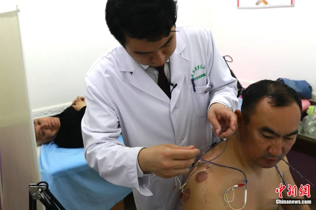 2024年5月24日,哈薩克斯坦阿斯塔納,馬文軒為哈患者使用針灸治療。張碩 攝