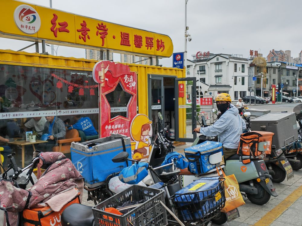 空調、微波爐、藥箱……記者在江蘇淮安經(jīng)濟技術開發(fā)區(qū)大潤發(fā)超市旁的溫馨驛站發(fā)現(xiàn),這里空間不大,但功能齊全。不時有騎手進出,在此短暫休息、補水、給手機充電、閑聊。