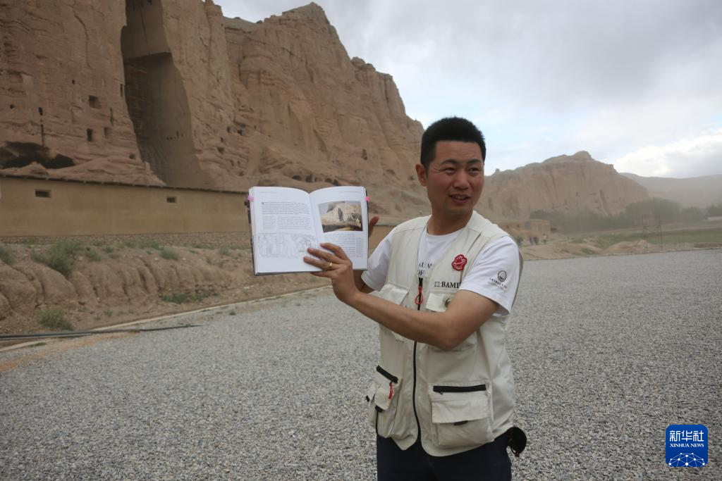 6月15日,在阿富汗巴米揚省的巴米揚大佛遺址區(qū),中國學者邵學成展示書中記載的巴米揚大佛相關內(nèi)容。新華社發(fā)(塞夫拉赫曼·薩菲攝)