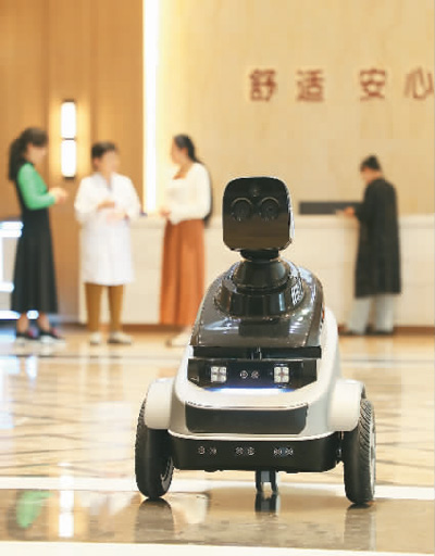 圖為在山東省東營市東營區(qū)德康寧醫(yī)養(yǎng)中心,智能機器人在巡檢。