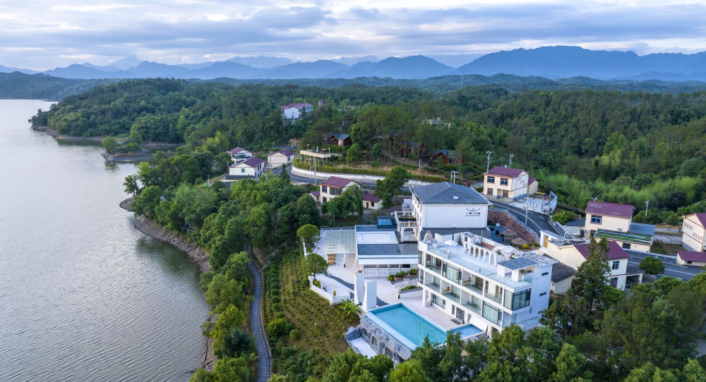 這是江西省武寧縣修河畔“一渡一山?!泵袼奕海恍┓掂l(xiāng)農(nóng)民在這里受聘為民宿管家(2024年6月3日攝,無人機照片)。新華社發(fā)(梁振堂 攝)