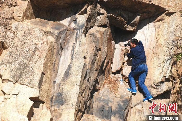 資料圖。圖為2018年,包金泉在科右中旗杜爾基鎮(zhèn)衙門毛杜嘎查境內(nèi),采集畢其格哈達題記內(nèi)容?!】朴抑衅煳奈锟脊叛芯克﹫D