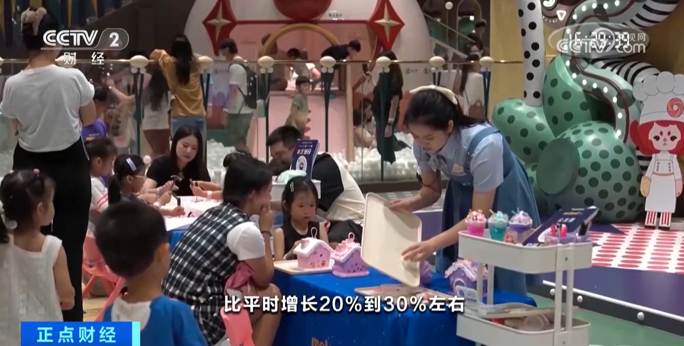某室內(nèi)游樂(lè)場(chǎng)深圳一方天地店值班經(jīng)理麥麗勤介紹:“比平時(shí)增長(zhǎng)20%至30%左右,因?yàn)楹⒆觽兎偶倭?,家長(zhǎng)們也有空帶孩子們過(guò)來(lái)玩?!?/p>
