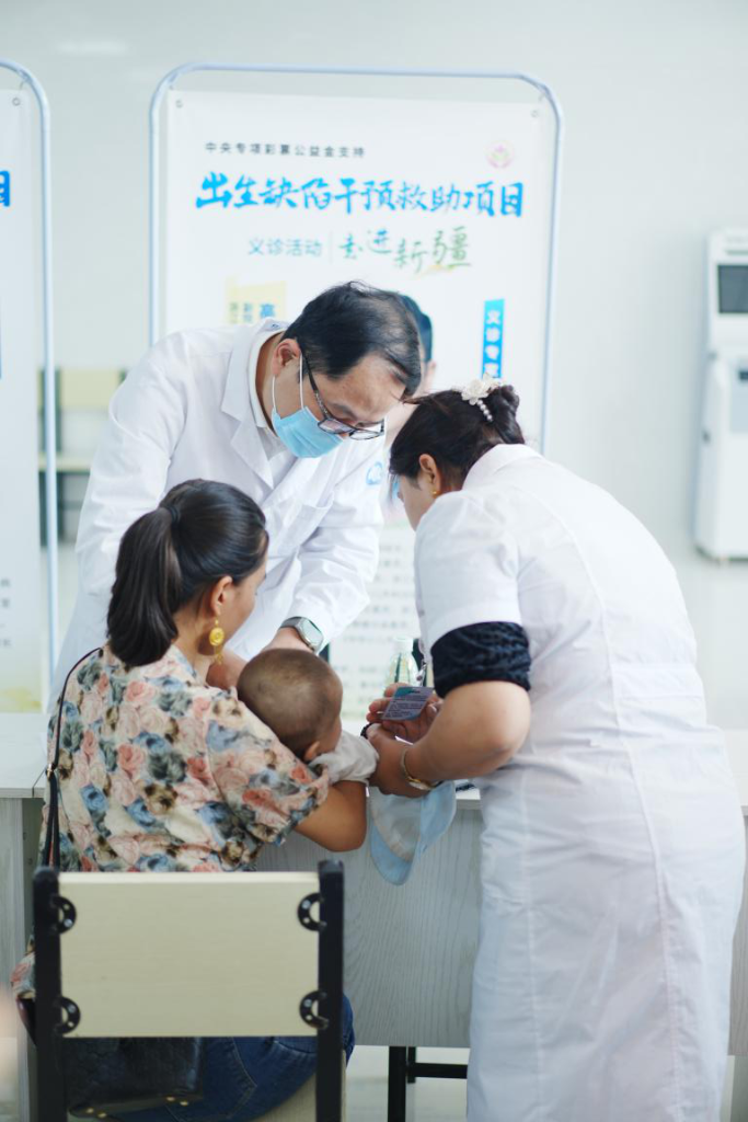 2023年8月,新疆和田縣人民醫(yī)院,專(zhuān)家正在為當(dāng)?shù)氐某錾毕莼純毫x診。(中國(guó)出生缺陷干預(yù)救助基金會(huì)供圖)