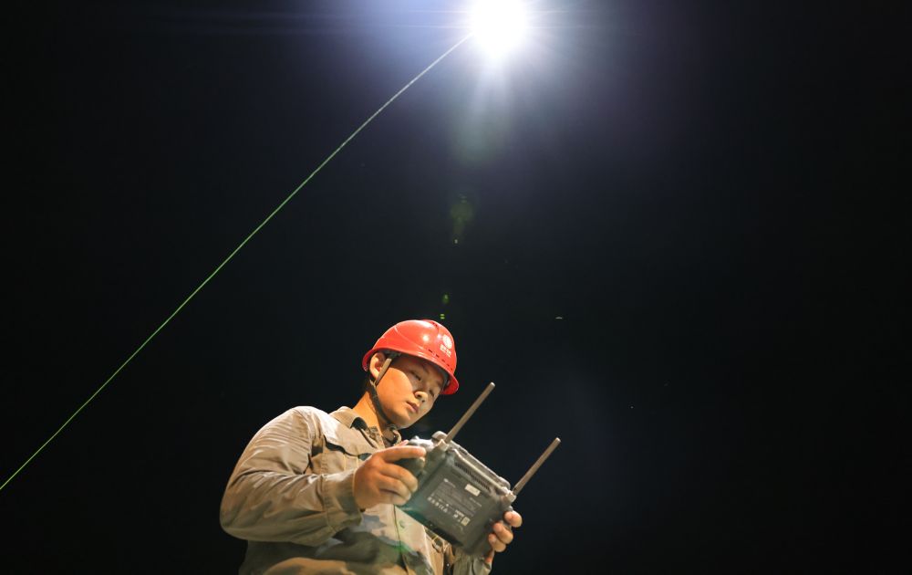 在堵口作業(yè)現(xiàn)場,劉子翔負(fù)責(zé)操作系留式無人機,為施工人員提供夜間照明。他時刻注意風(fēng)向、風(fēng)速,根據(jù)施工人員的需求,及時調(diào)整無人機的位置,確?!罢盏靡姟⒄盏昧痢?。