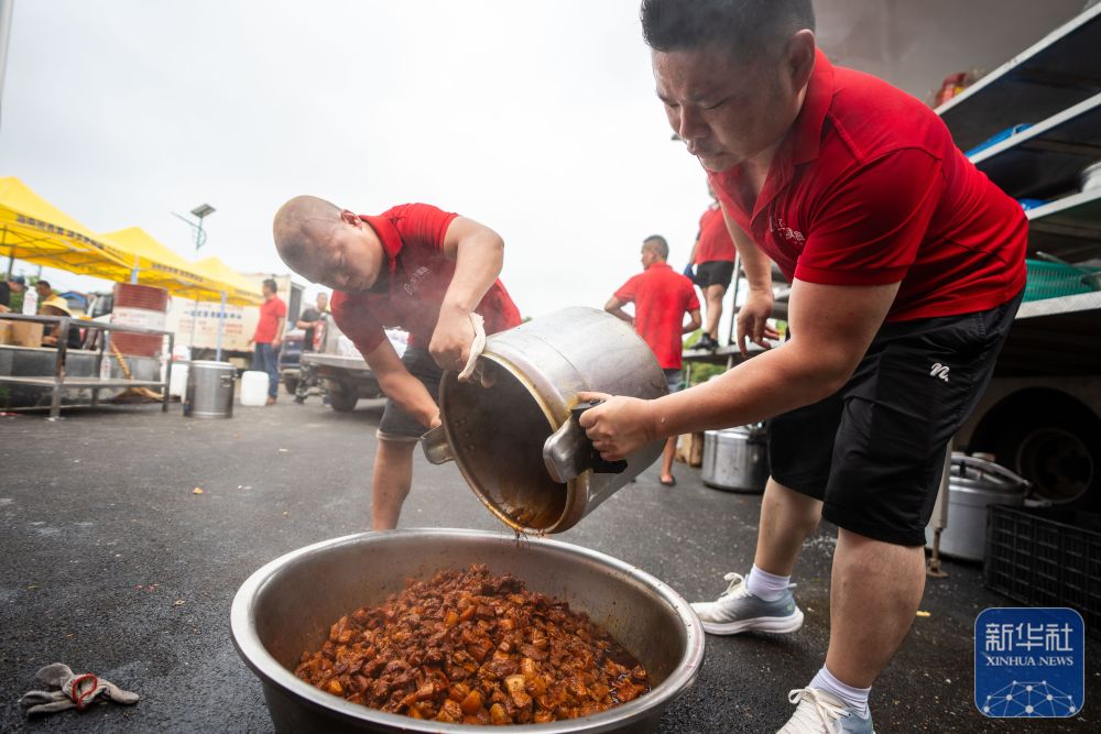 7月8日,在岳陽(yáng)市良心堡鎮(zhèn)望君洲村,志愿者在炒制菜肴。新華社記者 陳思汗 攝