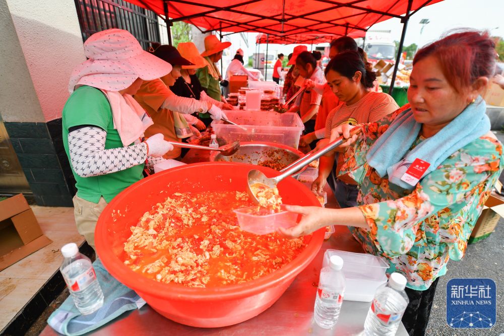 7月10日,在岳陽(yáng)市良心堡鎮(zhèn)望君洲村,志愿者倒出炒好的菜肴準(zhǔn)備打包。新華社記者 陳思汗 攝