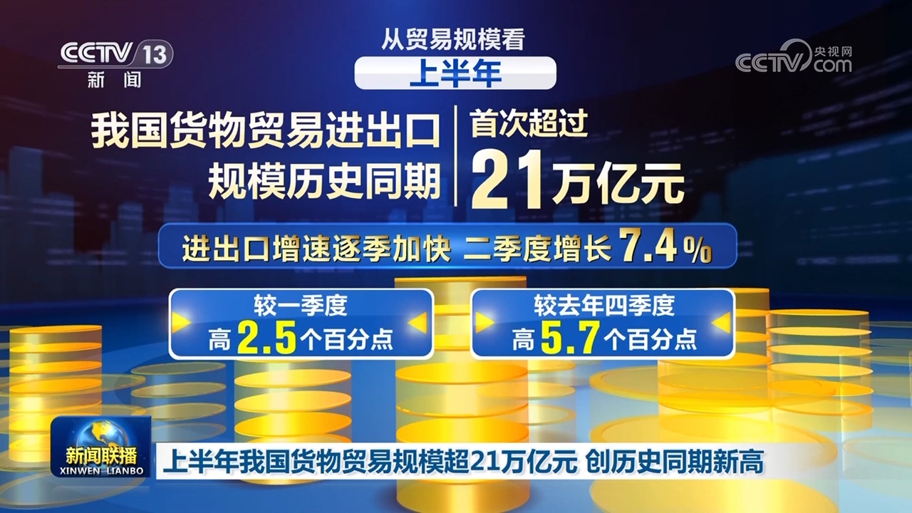 從貿(mào)易規(guī)模看,上半年,我國貨物貿(mào)易進(jìn)出口規(guī)模歷史同期首次超過21萬億元。進(jìn)出口增速逐季加快,二季度增長7.4%,較一季度和去年四季度分別高2.5個、5.7個百分點(diǎn),貨物貿(mào)易進(jìn)出口質(zhì)量持續(xù)提升、規(guī)模較快增長。