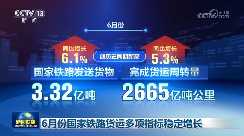國鐵集團(tuán)數(shù)據(jù)顯示,6月份,國家鐵路發(fā)送貨物3.32億噸,完成貨運周轉(zhuǎn)量2665億噸公里,同比分別增長6.1%、5.3%,創(chuàng)歷史同期新高。目前,我國鐵路貨運量、貨運周轉(zhuǎn)量等指標(biāo)穩(wěn)居世界首位。