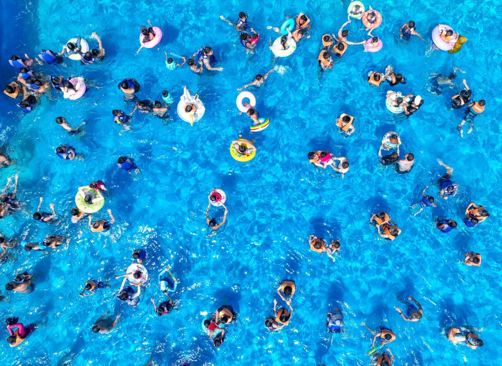 7月14日,人們?cè)谥貞c市酉陽(yáng)土家族苗族自治縣一水上樂園游玩戲水(無(wú)人機(jī)照片)。新華社發(fā)(邱洪斌攝)