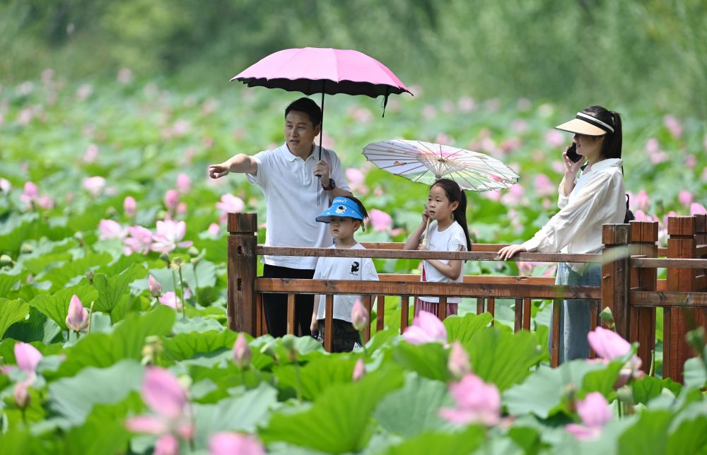 7月14日,人們?cè)诮K省泰州市天德湖公園荷花池賞荷游玩。新華社發(fā)(湯德宏攝)