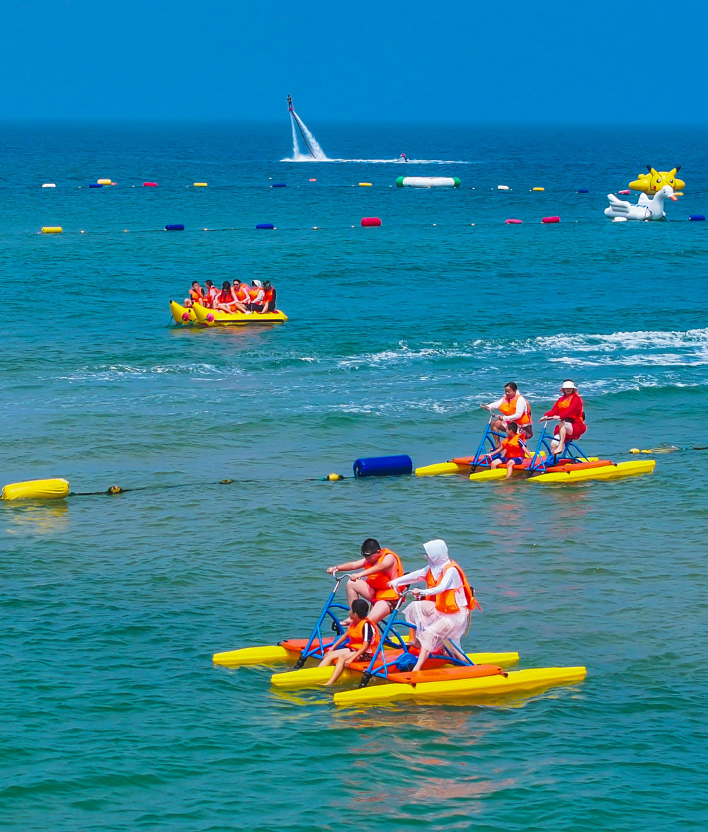 7月13日,游客在山東省榮成市那香海海水浴場(chǎng)體驗(yàn)水上娛樂項(xiàng)目(無(wú)人機(jī)照片)。新華社發(fā)(李信君攝)