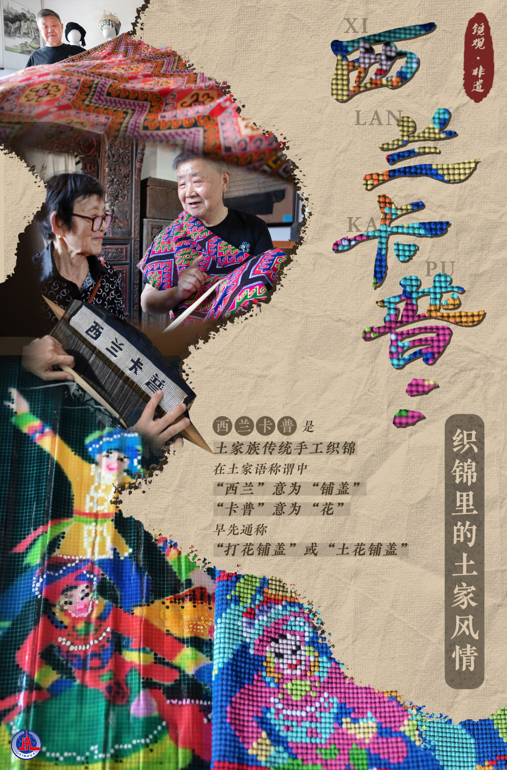 西蘭卡普是土家族傳統(tǒng)手工織錦,在土家語稱謂中,“西蘭”意為鋪蓋,“卡普”意為花,早先通稱“打花鋪蓋”或“土花鋪蓋”。土家孩子出生時外婆要送織錦,嬰幼兒時要蓋織錦,女孩子自小學習織錦,出嫁時在織機上制作西蘭卡普作為陪嫁。西蘭卡普記錄了土家族的風俗和情感,與土家人的生活息息相關,被譽為土家族的“五彩活化石”,2006年被列入國家級非物質(zhì)文化遺產(chǎn)名錄。