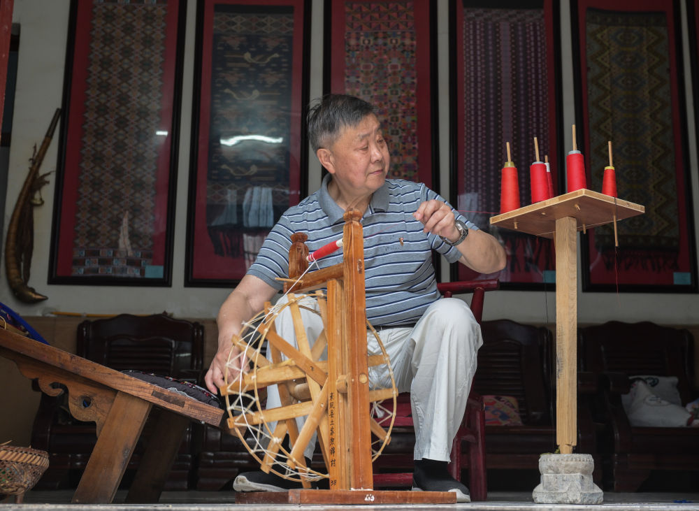 7月3日,湖北省來鳳縣桂花樹社區(qū),唐洪祥在紡線。