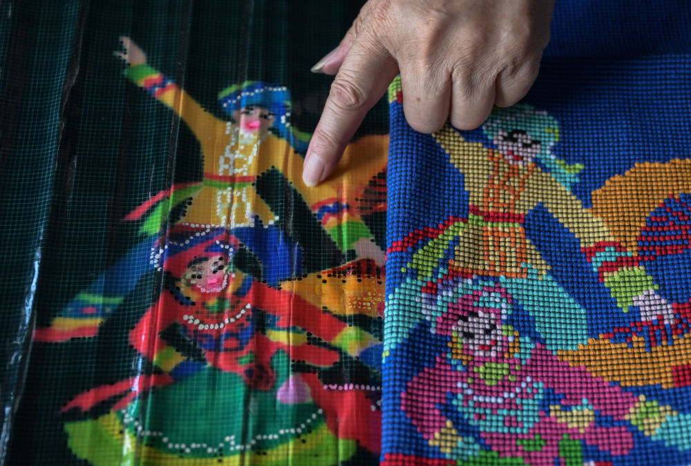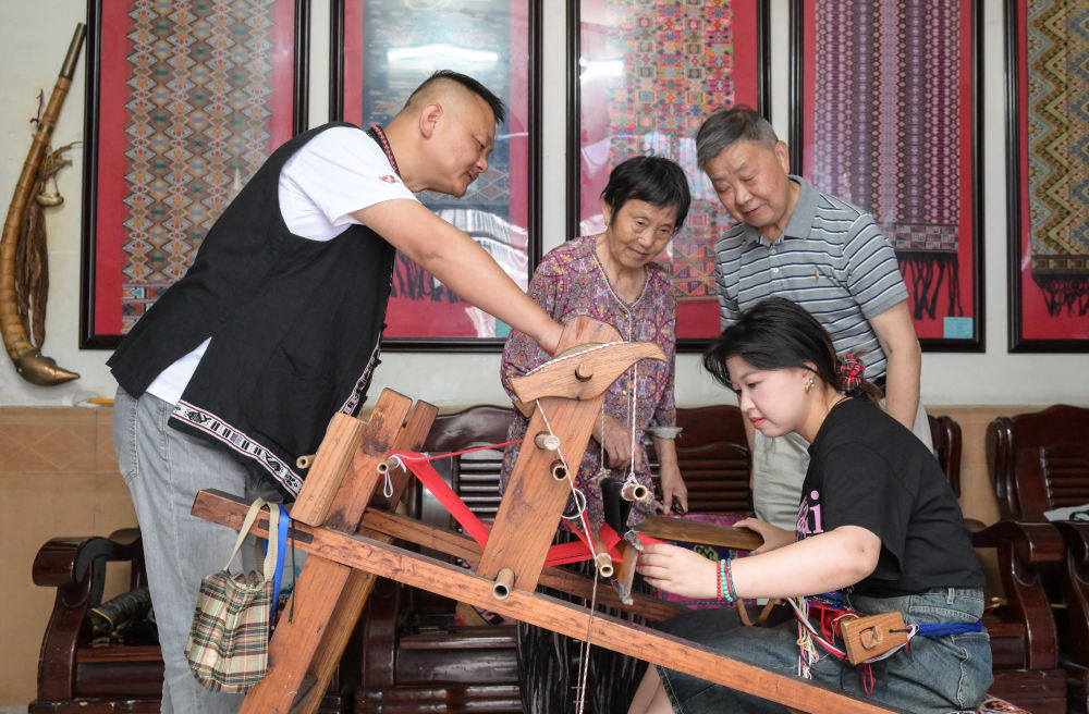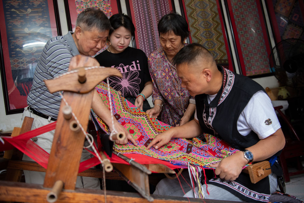 7月2日,唐洪祥的孫女唐鳴珂(后右一)在來鳳縣西蘭卡普培訓班上展示西蘭卡普成品。今年29歲的唐鳴珂國外留學后回到家鄉(xiāng),從事西蘭卡普的傳承發(fā)展工作。