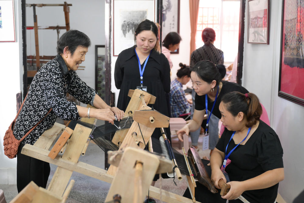 7月2日,唐洪祥的老伴劉秀琴(后左一)指導前來學藝的學員們操作織機。