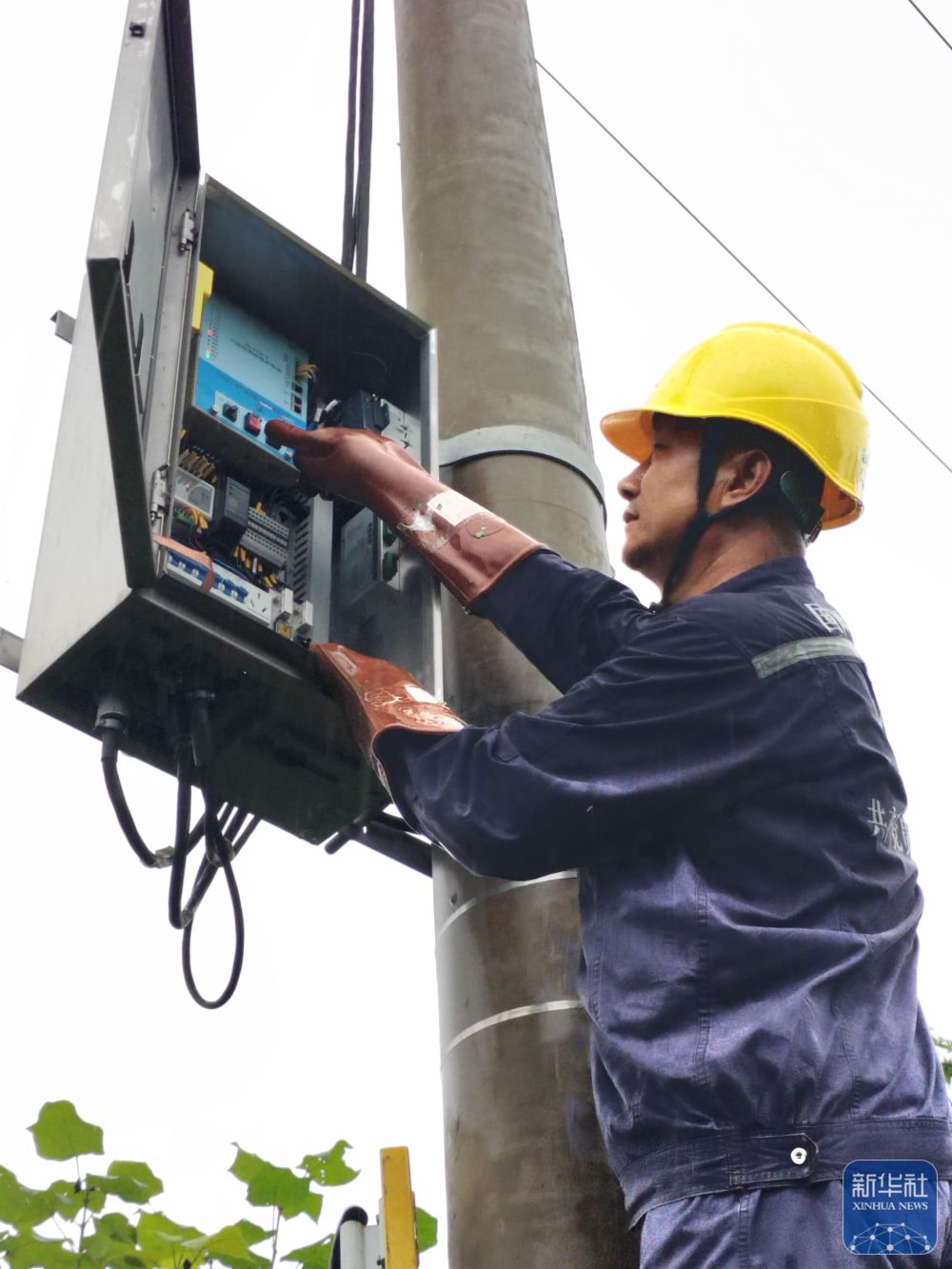 7月27日,在遼寧省丹東市,國(guó)家電網(wǎng)丹東供電公司員工對(duì)10千伏堡鎮(zhèn)線進(jìn)行檢查?! ⌒氯A社發(fā)
