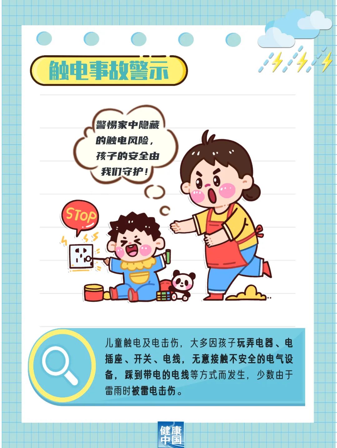 雷雨天氣不要讓孩子在室外玩耍;……倘若還是不小心觸電了,怎么辦?圖中知識(shí)快記牢!