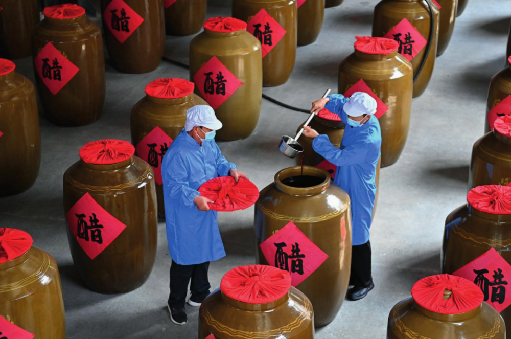 工作人員在山西省長治市平順縣龍溪鎮(zhèn)龍鎮(zhèn)村農旅產業(yè)融合發(fā)展示范園內查看醋的成色(2024年5月10日攝) 楊晨光攝/《瞭望》