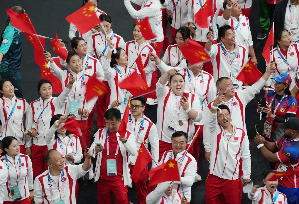 8月11日,中國(guó)體育代表團(tuán)在閉幕式上入場(chǎng)。新華社記者 鄭煥松 攝