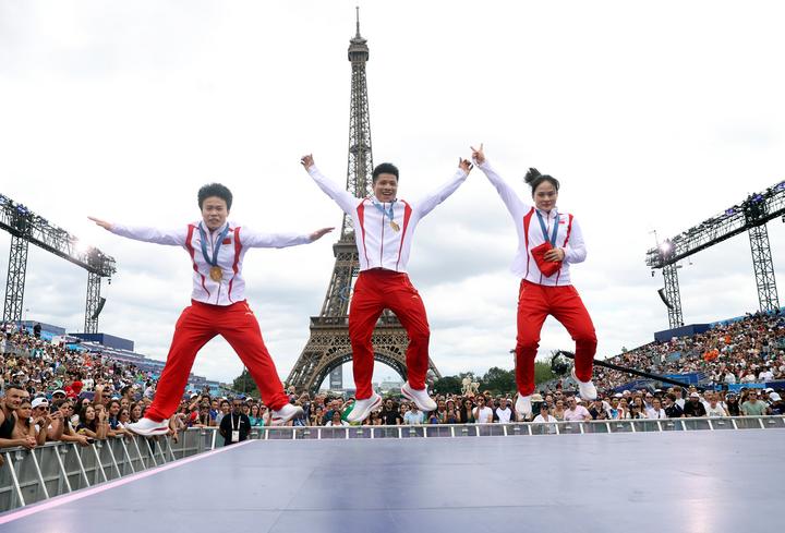 8月9日,中國(guó)舉重選手侯志慧(左)、李發(fā)彬(中)和羅詩(shī)芳在冠軍公園慶祝。當(dāng)日,觀眾來(lái)到位于法國(guó)巴黎特羅卡德羅廣場(chǎng)的冠軍公園,與奧運(yùn)獎(jiǎng)牌獲得者分享榮耀。新華社記者 雒圓 攝