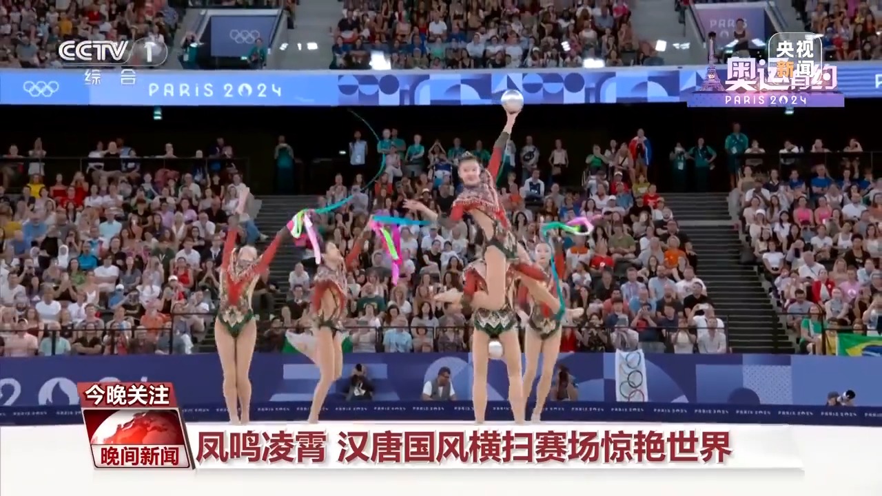 而在藝術(shù)體操女子團體全能決賽中,中國藝術(shù)體操的姑娘們以總分69.8分,拿下該項目的金牌。在決賽三帶兩球項目《鳳鳴凌霄》表演中,伴隨著動聽的音樂,姑娘們靈活地運用彩帶和球,以精準的動作、極具張力的表演,詮釋了漢唐國風(fēng)的民族美學(xué)。