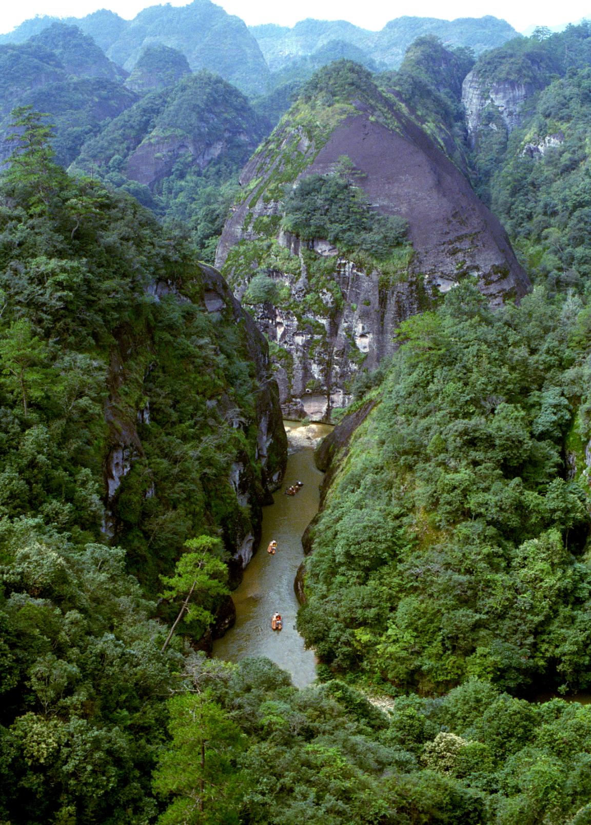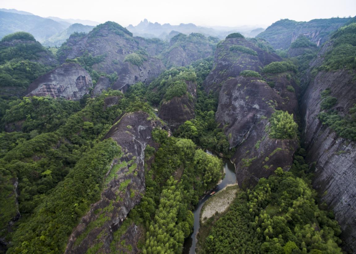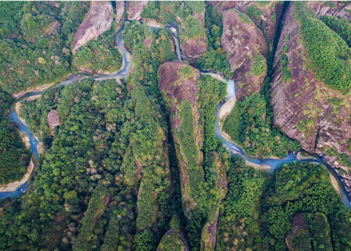 一下、一下、又一下!隨著排工在溪水里劃動(dòng)竹竿,竹排動(dòng)力十足地乘水漂流。隨即,排工在排上唱起韻味十足的山歌,歌聲悠揚(yáng),回響在溪水如碧的峽谷間。兩岸石壁峭立,因不同的風(fēng)化程度呈現(xiàn)各異奇觀,盡顯大自然的鬼斧神工。有著“九十九曲,八十八灘”美名的上清溪位于福建省三明市泰寧縣,宛若一條蛟龍,盤(pán)踞在深山幽谷中,纏繞于赤壁丹崖間。