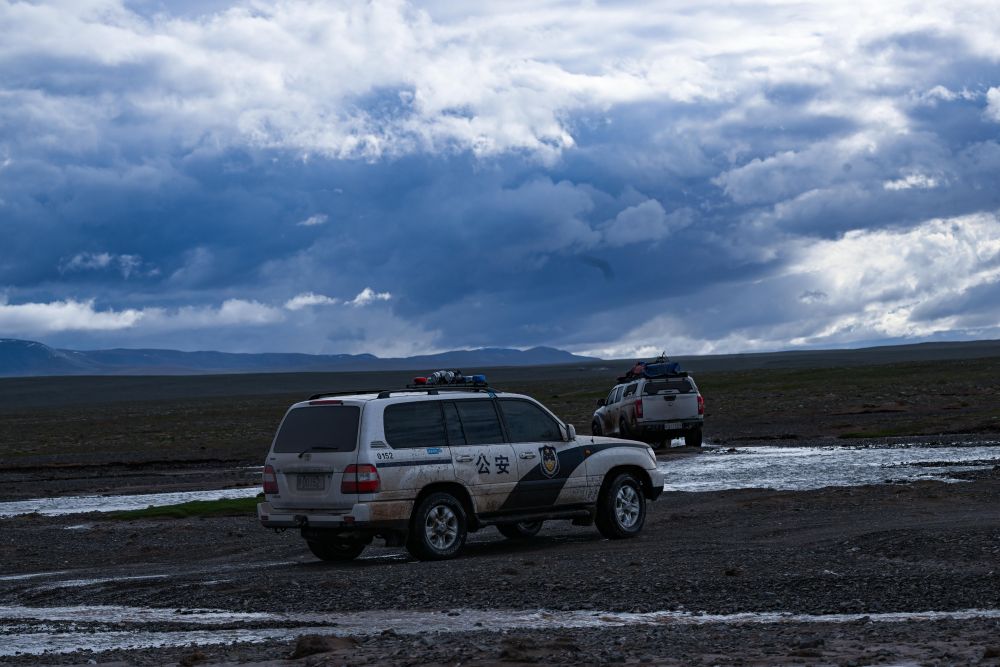 可可西里的夏季可謂一天見四季,十里不同天。初入無人區(qū)還是晴空萬里,走了十幾公里后車隊就被烏云籠罩,分不清是雨點還是冰雹,噼里啪啦地砸向車窗。