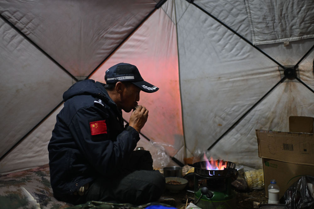 7月8日,在可可西里卓乃湖區(qū)域,巡山隊員尼瑪扎西在帳篷里吃晚飯。新華社記者 張龍 攝
