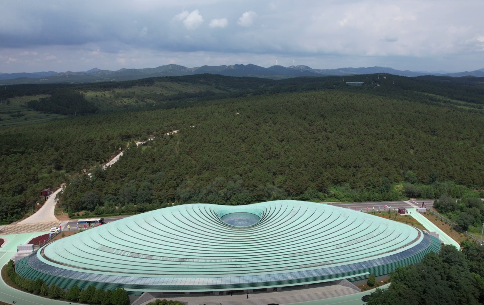 積石冢展覽館鳥瞰,遠(yuǎn)處建筑為牛河梁女神廟展覽館(央廣網(wǎng)記者 李子平 攝)