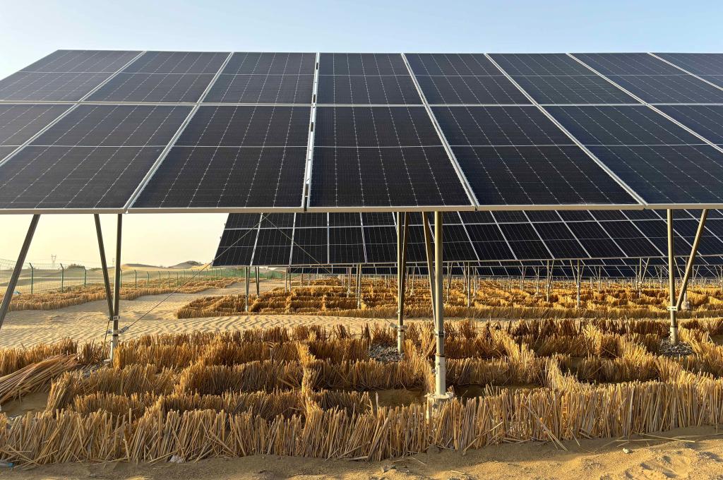 從新疆庫(kù)爾勒市出發(fā),沿著烏若高速向東南方向駛?cè)搿八劳鲋!薄死敻缮衬沟?,寫著“沙戈荒光伏生態(tài)治沙示范項(xiàng)目”大字的一座光伏電站映入眼簾。光伏板下及光伏電站外圍,青黃色的蘆葦稈扎入沙中構(gòu)成“圍棋盤”式的草方格,將黃沙牢牢包圍。