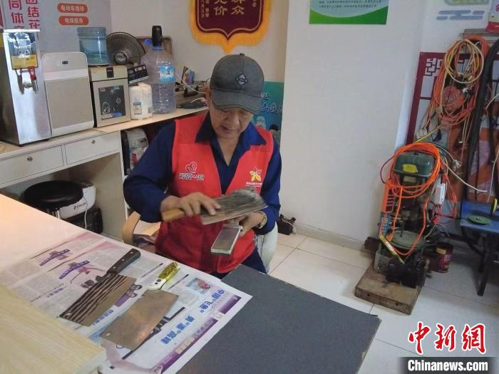 日前,“鑄牢共同體 中華一家親”主題宣傳“塞上江南寫新篇”集中采訪團走進寧夏銀川市金鳳區(qū)黃河東路街道的頤和城府社區(qū)。圖為智福德正在為社區(qū)居民打磨刀具。中新網(wǎng)記者 劉玥晴 攝
