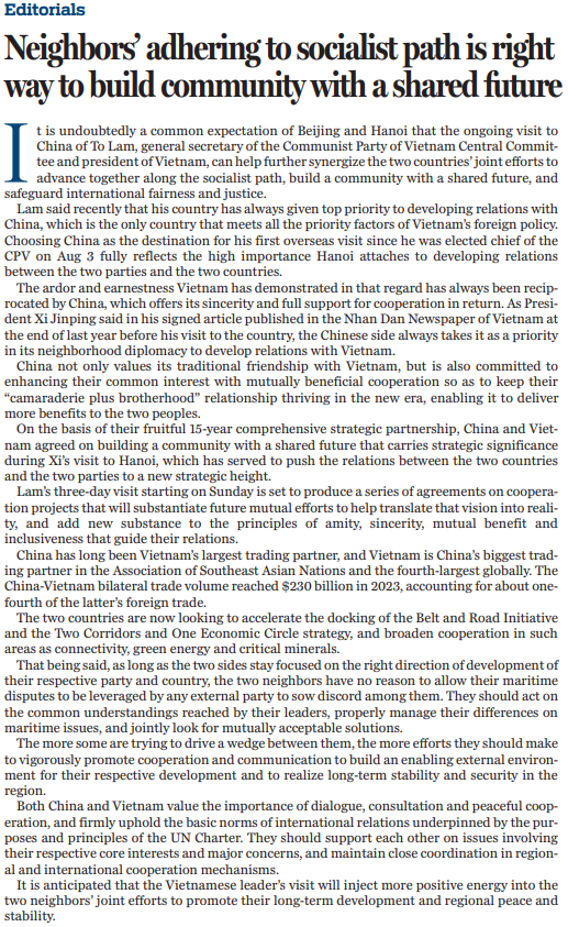此次訪華是蘇林自8月3日當選越共中央總書記以來的首次外訪,彰顯了越方對發(fā)展兩黨兩國關(guān)系的高度重視。對于越方展現(xiàn)出的熱情與誠意,中方給與積極回應,全力支持雙方合作。