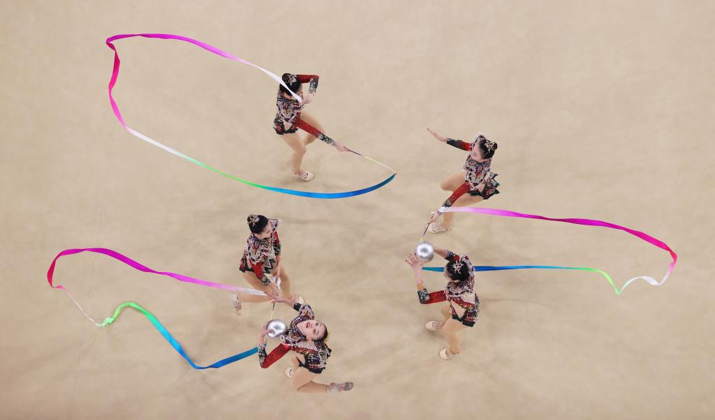 8月10日,中國隊在巴黎奧運會藝術(shù)體操項目集體全能決賽中。新華社記者 郭昱 攝