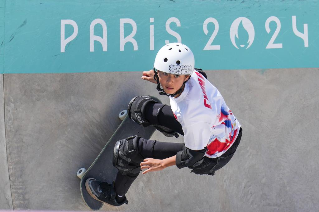 8月6日,中國選手鄭好好在巴黎奧運會滑板女子碗池預(yù)賽中。新華社記者 杜宇 攝
