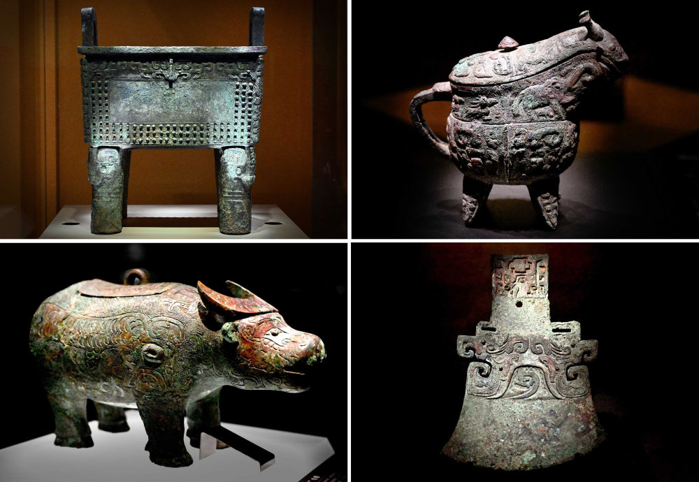 這是2024年2月23日拍攝的河南安陽(yáng)殷墟博物館新館內(nèi)展出的“司母辛”銅鼎(左上)、“亞長(zhǎng)”銅觥(右上)、“亞長(zhǎng)”牛尊(左下)、“亞長(zhǎng)”銅鉞(拼版照片)。新華社記者 李安攝