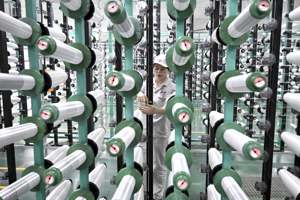 在位于河南安陽(yáng)林州市的河南光遠(yuǎn)新材料股份有限公司電子布準(zhǔn)備車(chē)間,工作人員在檢查整經(jīng)機(jī)機(jī)臺(tái)(2024年2月22日攝)。該公司通過(guò)自主技術(shù)創(chuàng)新,攻克“卡脖子”技術(shù),研發(fā)出5G用低介電電子紗、5G用超薄電子布等產(chǎn)品。新華社記者 李安攝