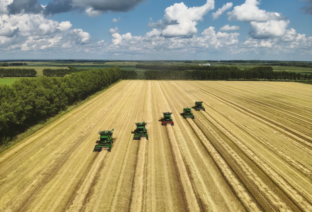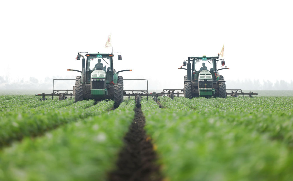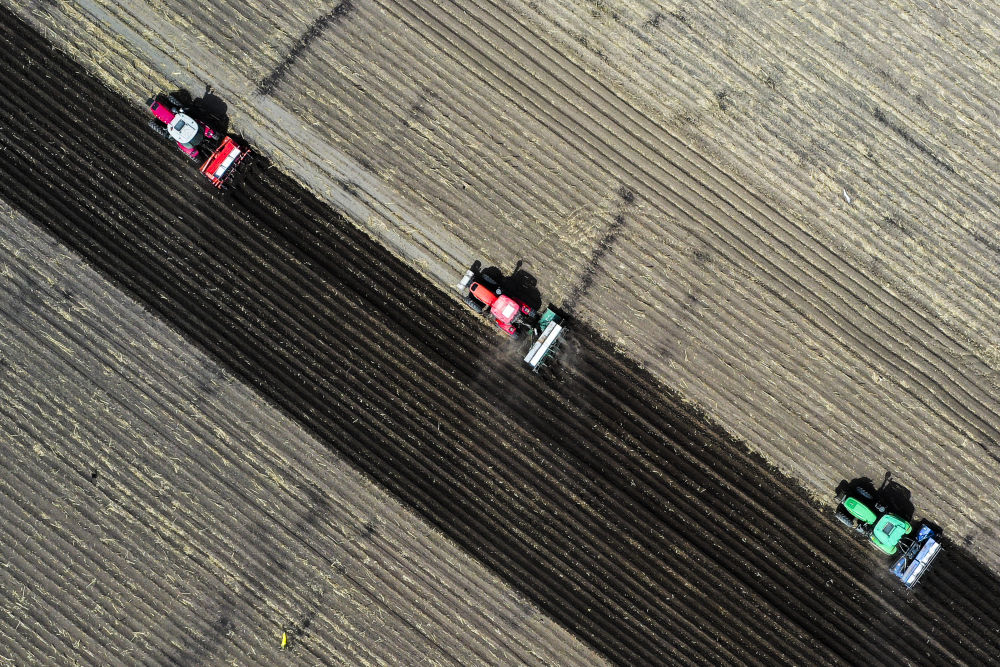 2024年6月25日,大型農(nóng)機(jī)在黑龍江北大荒集團(tuán)鶴山農(nóng)場(chǎng)作業(yè),為土壤增溫放寒(無人機(jī)照片)。今年,黑龍江推進(jìn)高標(biāo)準(zhǔn)農(nóng)田建設(shè)、侵蝕溝治理和農(nóng)田防護(hù)林更新修復(fù)一體化實(shí)施,建設(shè)高標(biāo)準(zhǔn)農(nóng)田1400萬(wàn)畝、治理侵蝕溝1.2萬(wàn)條,全面加強(qiáng)黑土地保護(hù)利用。