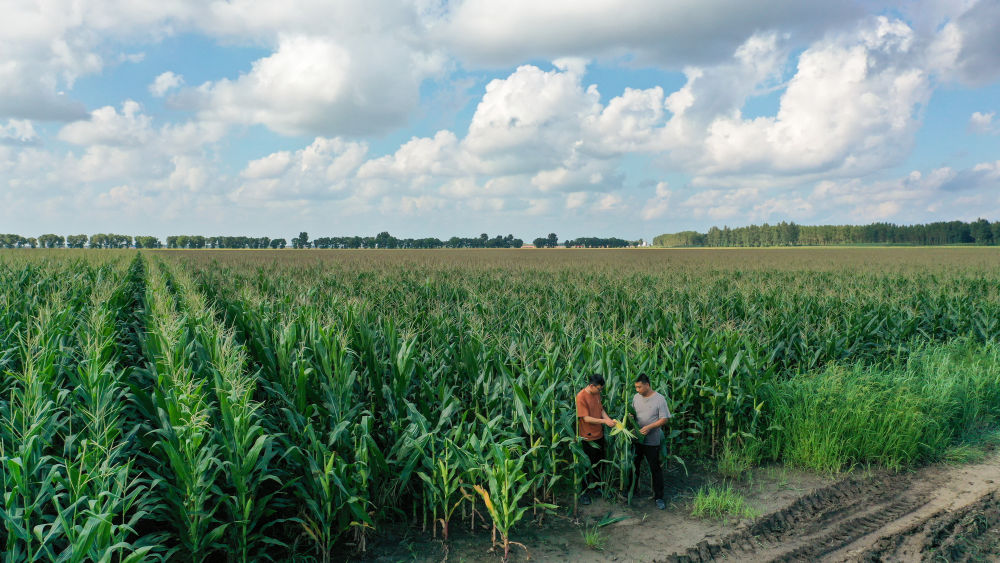 2024年8月8日,在吉林省梨樹縣孤家子鎮(zhèn)兩家子村,當(dāng)?shù)剞r(nóng)業(yè)發(fā)展服務(wù)站高級(jí)農(nóng)藝師蘭雨壯(左)與四平市強(qiáng)盛農(nóng)機(jī)農(nóng)民專業(yè)合作社負(fù)責(zé)人查看玉米長(zhǎng)勢(shì)(無人機(jī)照片)。多年來,地處世界“黃金玉米帶”的全國(guó)產(chǎn)糧大縣吉林省梨樹縣,強(qiáng)化科技在農(nóng)業(yè)生產(chǎn)中的支撐作用,持續(xù)提升糧食和重要農(nóng)產(chǎn)品穩(wěn)產(chǎn)保供能力。