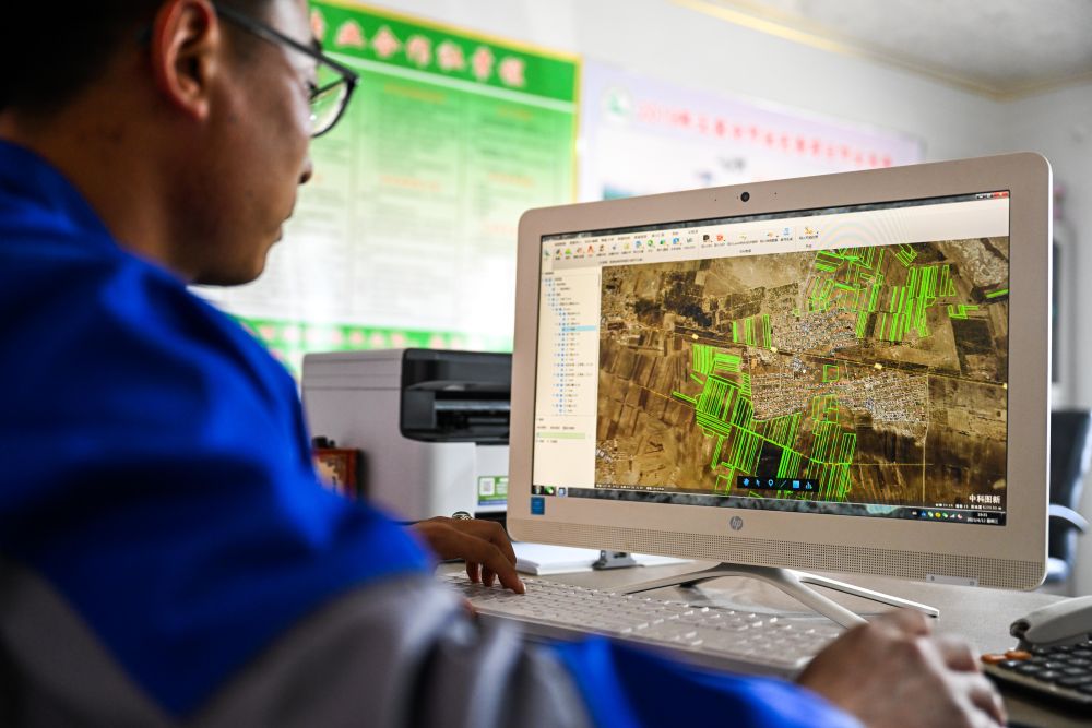 2023年4月12日,在內(nèi)蒙古通遼市科爾沁左翼中旗腰林毛都鎮(zhèn),一家農(nóng)業(yè)合作社的負(fù)責(zé)人查看耕種衛(wèi)星地圖。