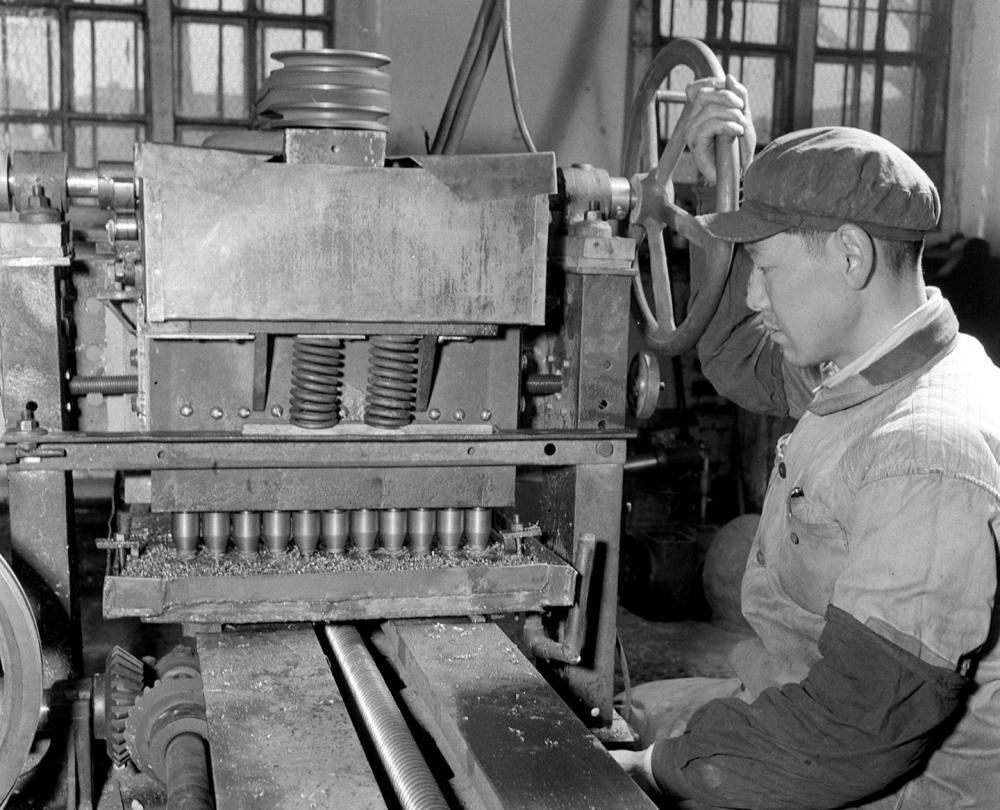 1958年2月12日,哈爾濱機(jī)聯(lián)機(jī)械廠四車間老工人宋振東(鉗工),經(jīng)過(guò)一月多的刻苦鉆研,創(chuàng)造出一臺(tái)多頭鉆床,它的生產(chǎn)效率比一般鉆床要提高效率11倍。新華社記者佟德印攝